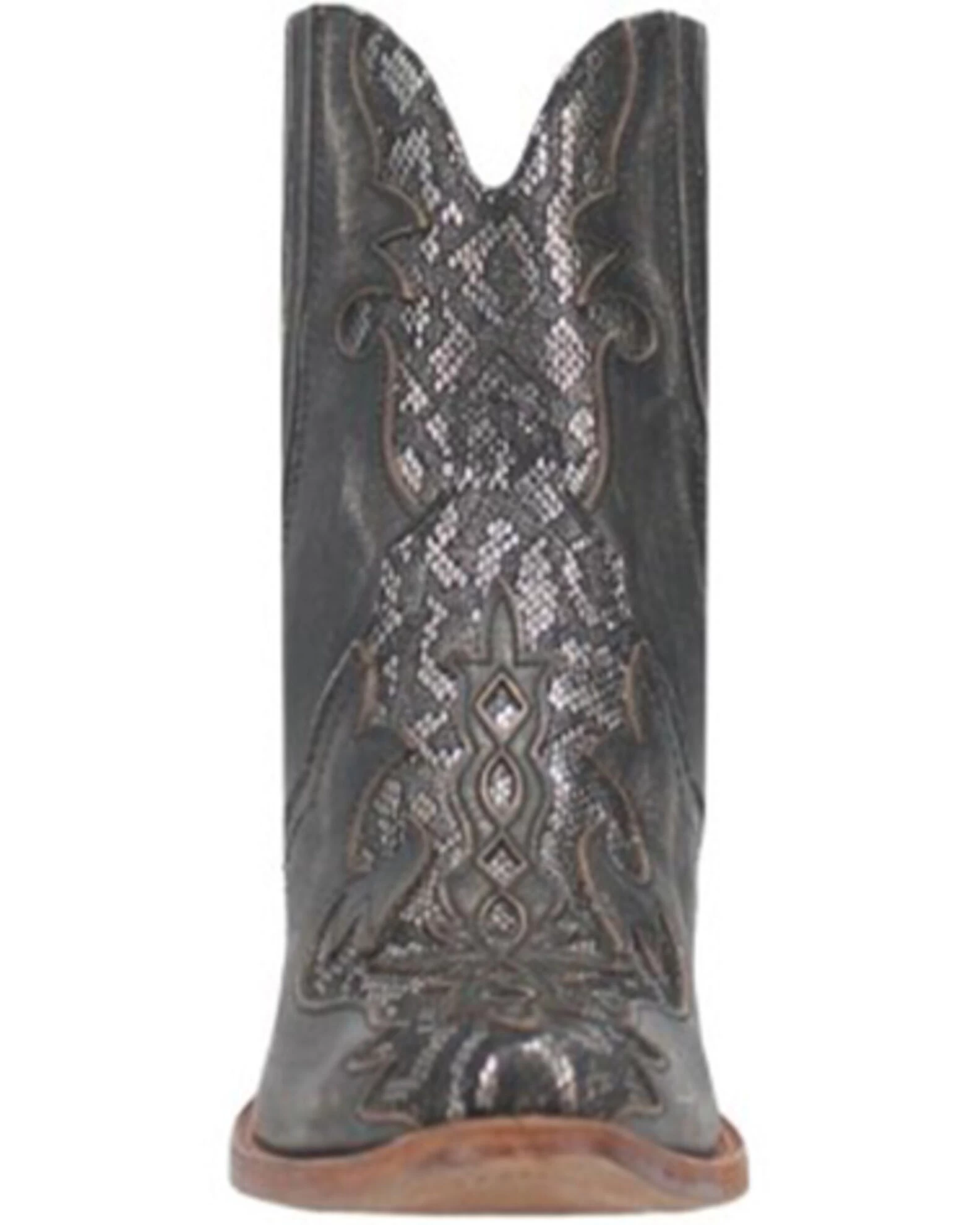 - Solid black with silver metallic snake print inlay design on front