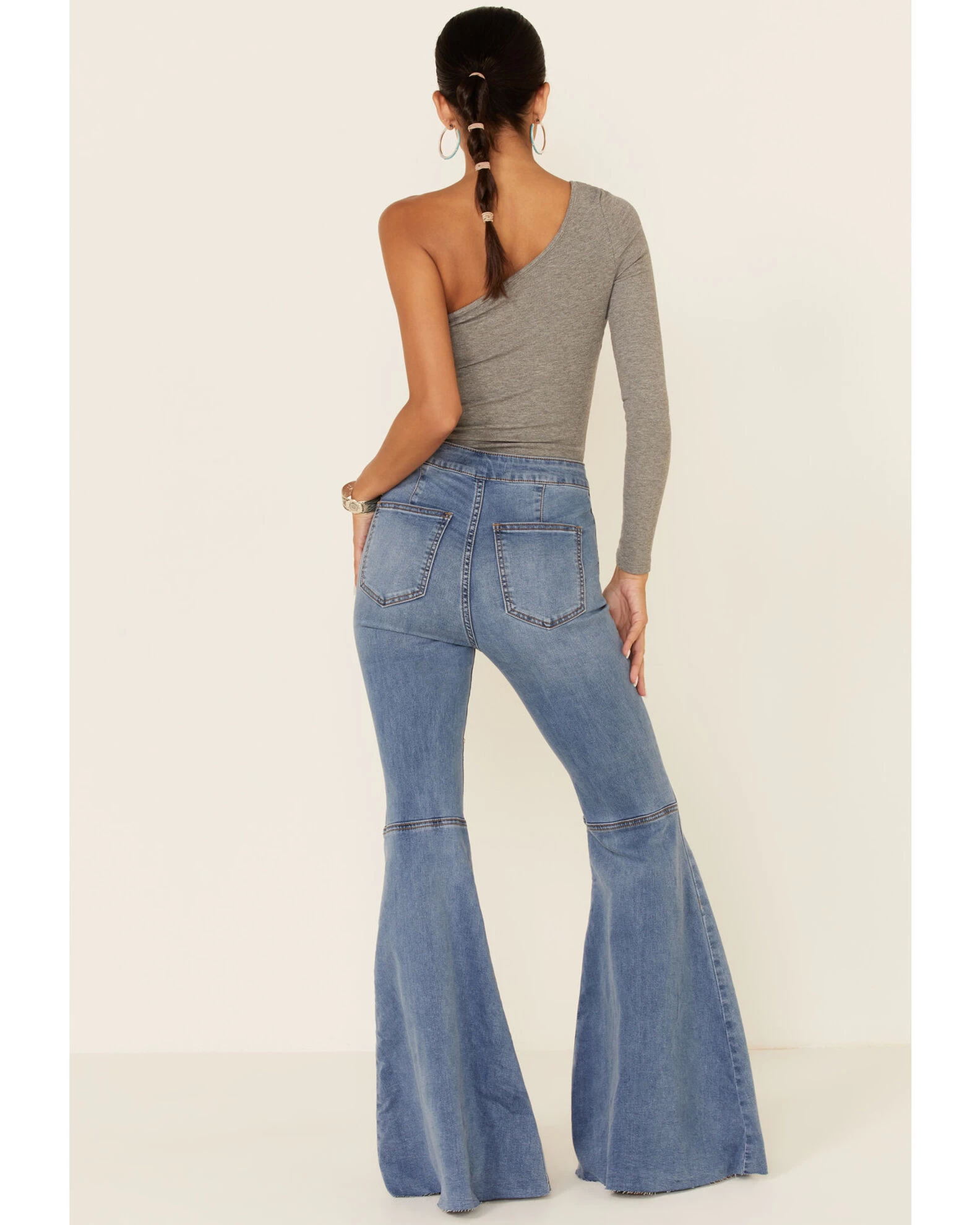 - Exaggerated flare at knees with behind the knee seam detailing