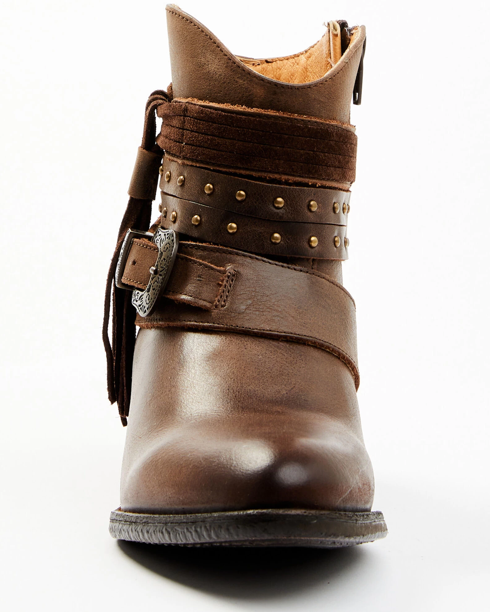 - Wrap-around studded and adjustable buckle straps with fringe detail